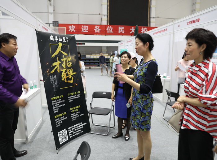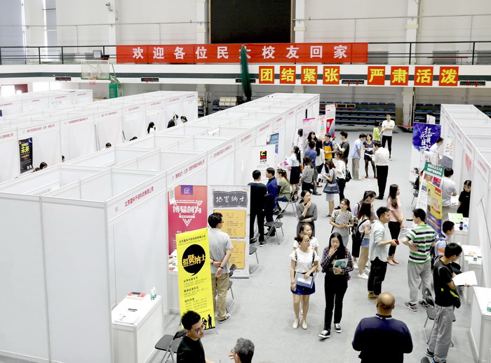“欢迎各位民大校友回家”,这是首场校友企业招聘会现场打出的横幅。