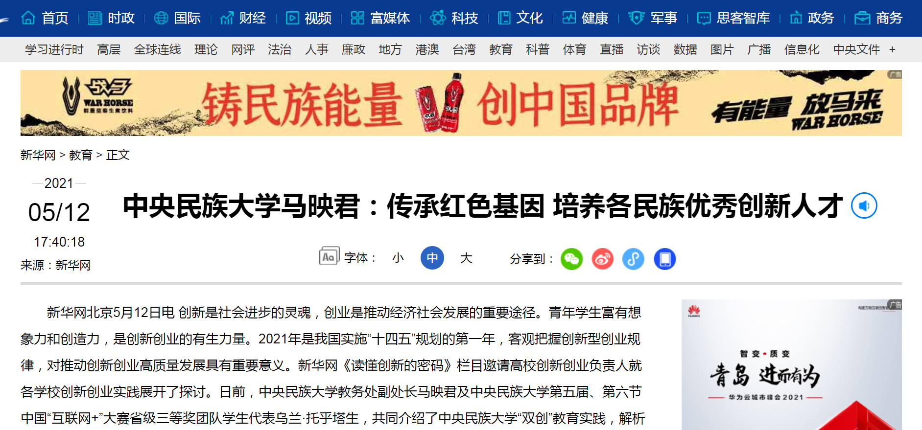 5月12日,新华网以“传承红色基因 培养各民族优秀创新人才”为题报道我校人才培养创新创业实践工作。创新是社会进步的灵魂,创业是推动经济社会发展的重要途径。青年学生富有想象力和创造力,是创新创业的有生力量。2021年是我国实施“十四五”规划的第一年,客观把握创新型创业规律,对推动创新创业高质量发展具有重要意义。新华网《读懂创新的密码》栏目邀请我校教务处副处长马映君及william威廉中文官网第五届、第六节中国“互联网+”大赛省级三等奖团队学生代表乌兰·托乎塔生,共同介绍了我校“双创”教育实践,解析了高校创新的奥义。文章链接如下:http://education.news.cn/2021-05/12/c_1211152727.htm