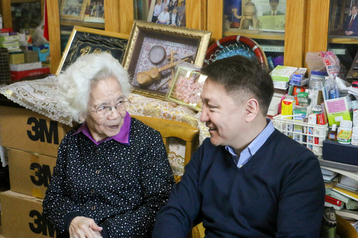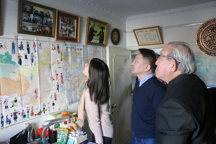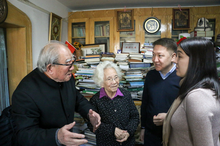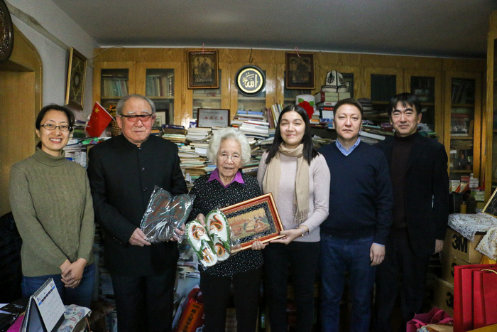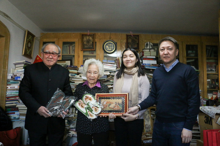 胡振华教授与阿扎玛特·乌谢诺夫妇亲切交谈,详细询问了他们的工作及生活情况。阿扎玛特·乌谢诺夫大使向胡振华先生及夫人赠送民族工艺品,亲切询问二老身体状况及生活情况。阿扎玛特·乌谢诺夫回忆起自己1998年在中国留学期间,受到胡振华教授夫妇,尤其是穆淑惠女士诸多帮助,结下了良好的情谊,他动容地说道:“来到老师家里,就跟回到我自己的家一样亲切”。