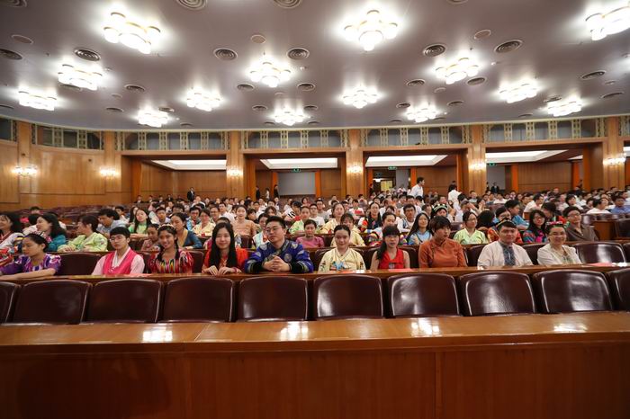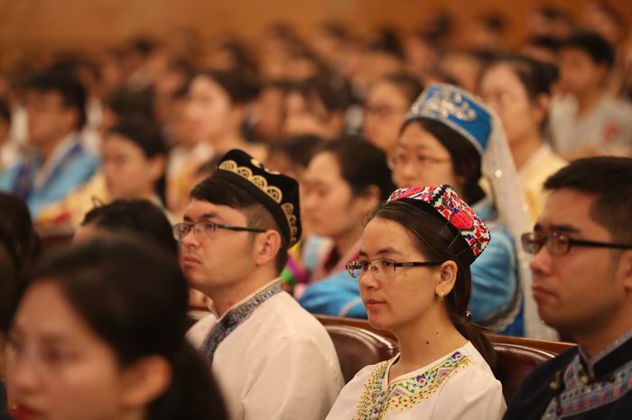 10时,习近平等领导同志步入大礼堂,全场响起热烈掌声。中华人民共和国国歌音乐声响起,全体人员起立,高唱国歌。我校学生代表站姿笔挺,歌声嘹亮,响彻全场,充分展示了高校大学生的风采。